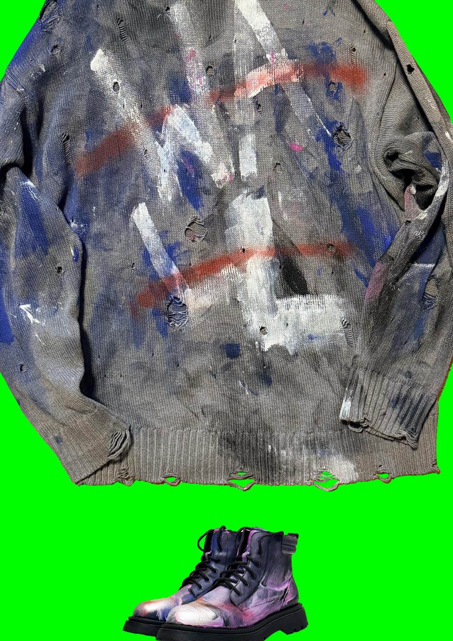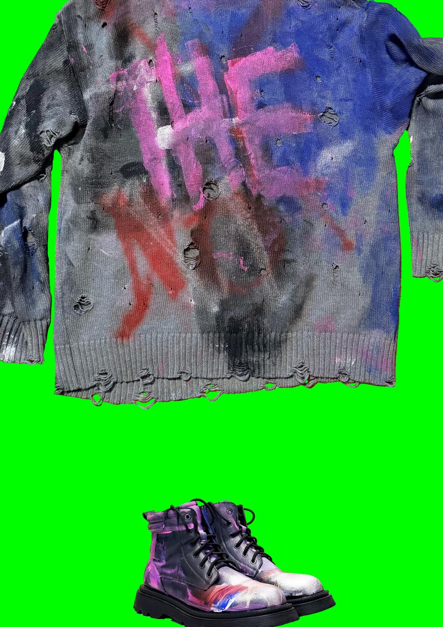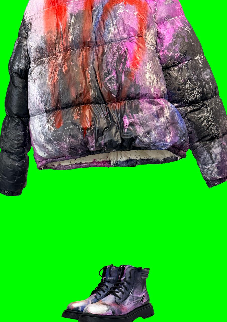 Texture, drips, colour traces — as if the jacket went through an algorithmic storm.